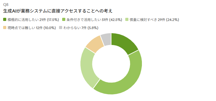 「生成AIが業務システムに直接アクセスすることについてどう思いますか」という質問では、「積極的に活用したい」「条件付きで活用したい」と回答した割合が合計で約60%に達しました。条件として求められるのは「権限・ロール管理の明確化」「操作ログ・監査証跡の確保」「実行前の人による確認」といったガバナンス面の整備です。