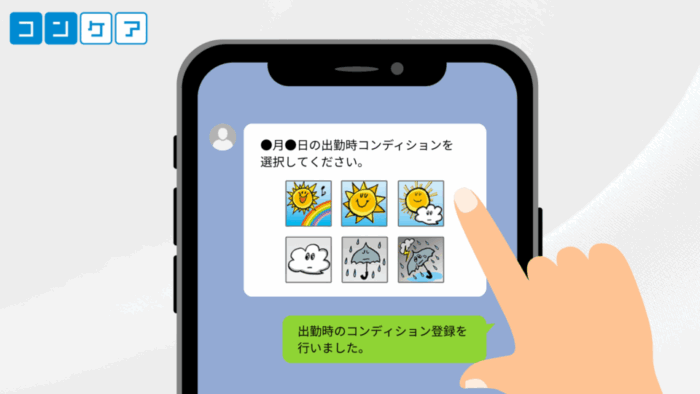 - 出退勤時にチャットツール上で表示される「お天気マーク」を選択するだけで、その日のコンディションを登録可能